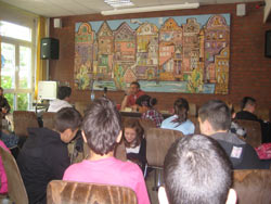 Die komplette Jahrgangsstufe 5 war anwesend, um Cora, ihre Freunde und das Rätsel um die schwarze Dame kennen zu lernen. Und da die Kölner gerne und schnell Freundschaft schließen, wurden Cora, Carlo und Anna sofort freundlich im Kreis der Kinder aufgenommen.