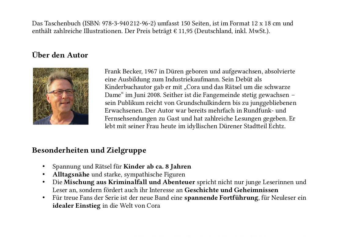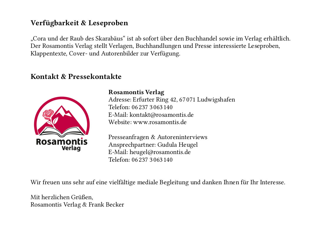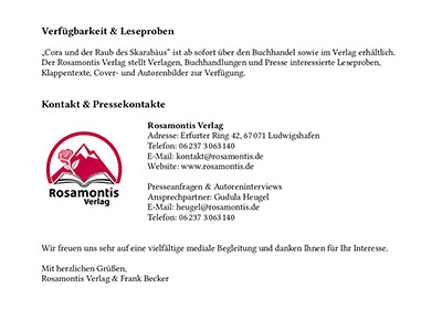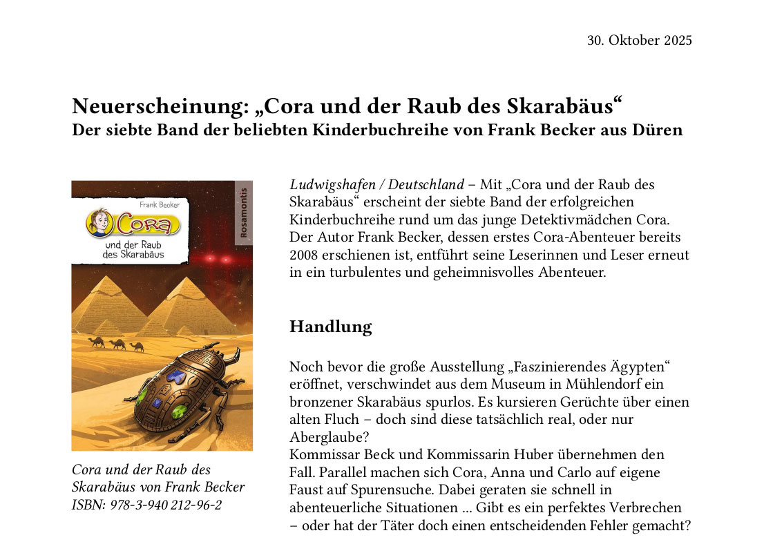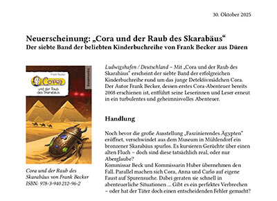 Pressemitteilung im Oktober 2025 zur Buchveröffentlichung des siebten Bandes "Cora und der Raub des Skarabäus"