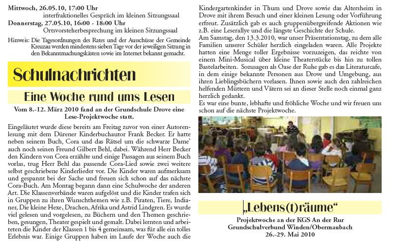 Rückblick über Schulprojekt im Amtsblatt Kreuzau 04/2010
