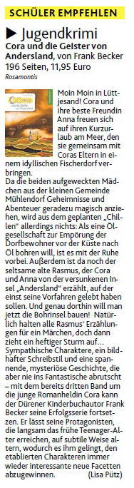 Die Schülerredaktion "Zeitung und Schule" (Lisa Pütz) bei den Dürener Nachrichten schrieb über Band 3 "Cora und die Geister von Andersland" eine Buchrezension.